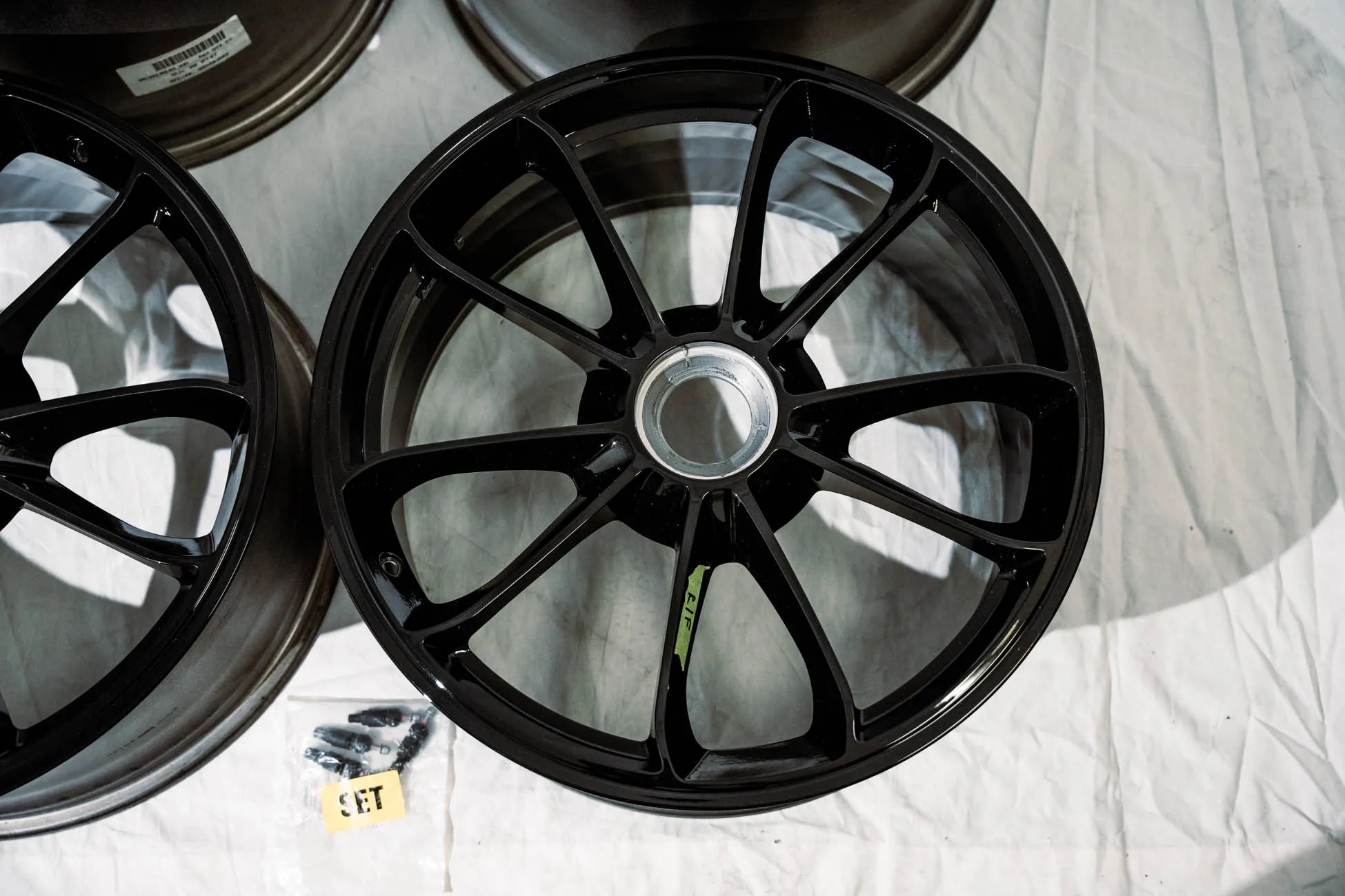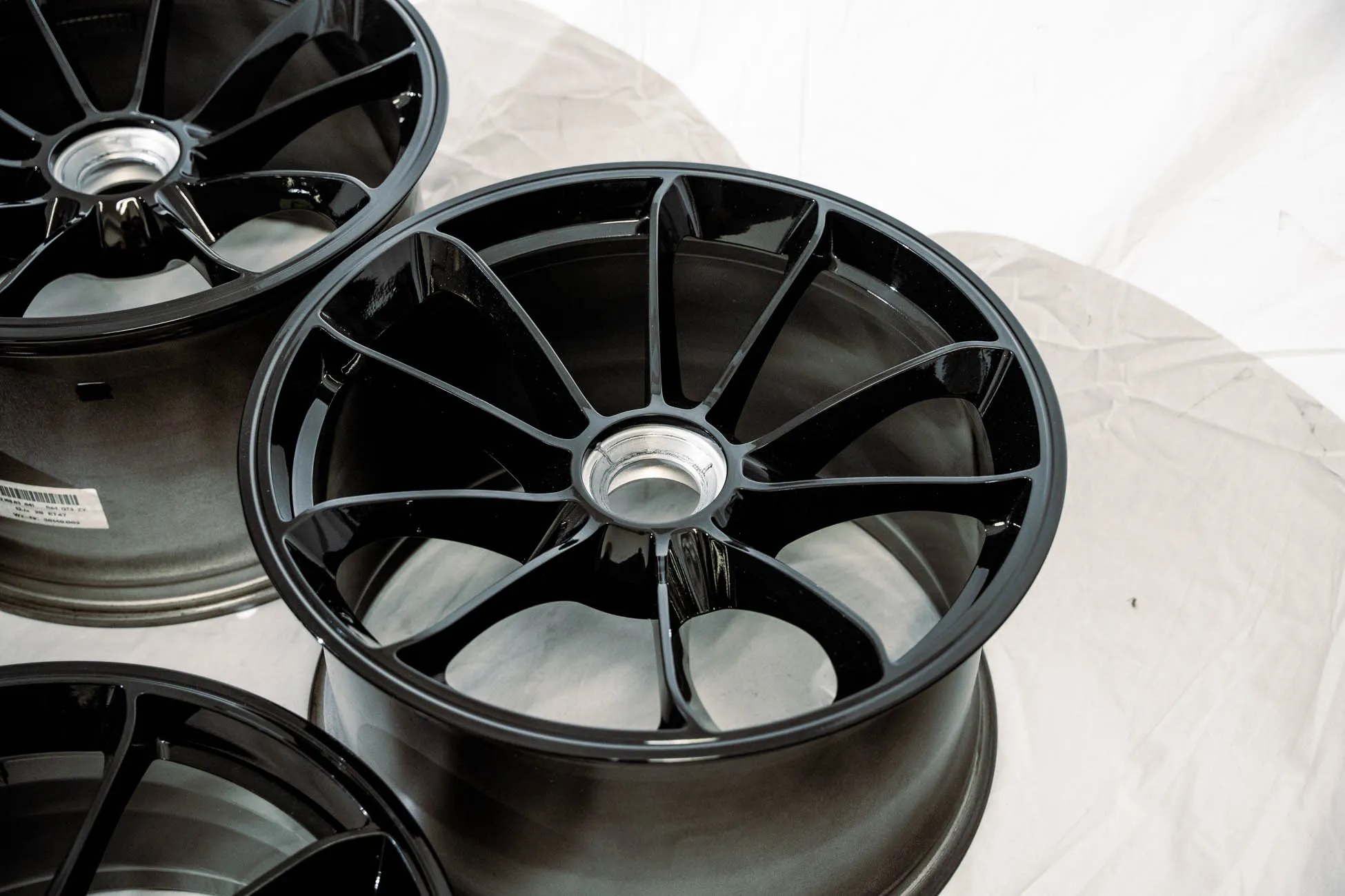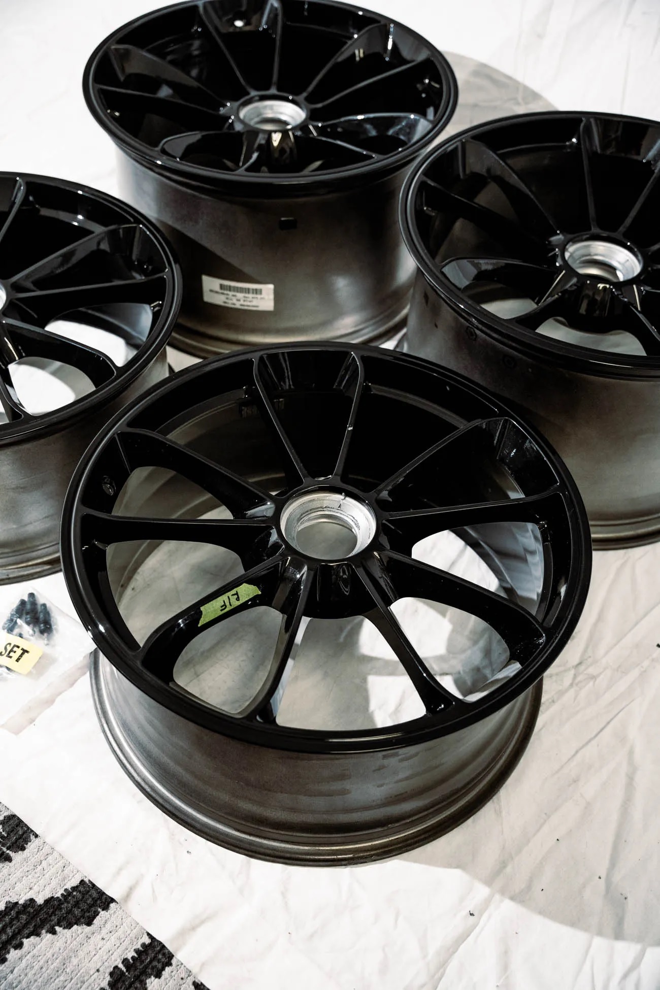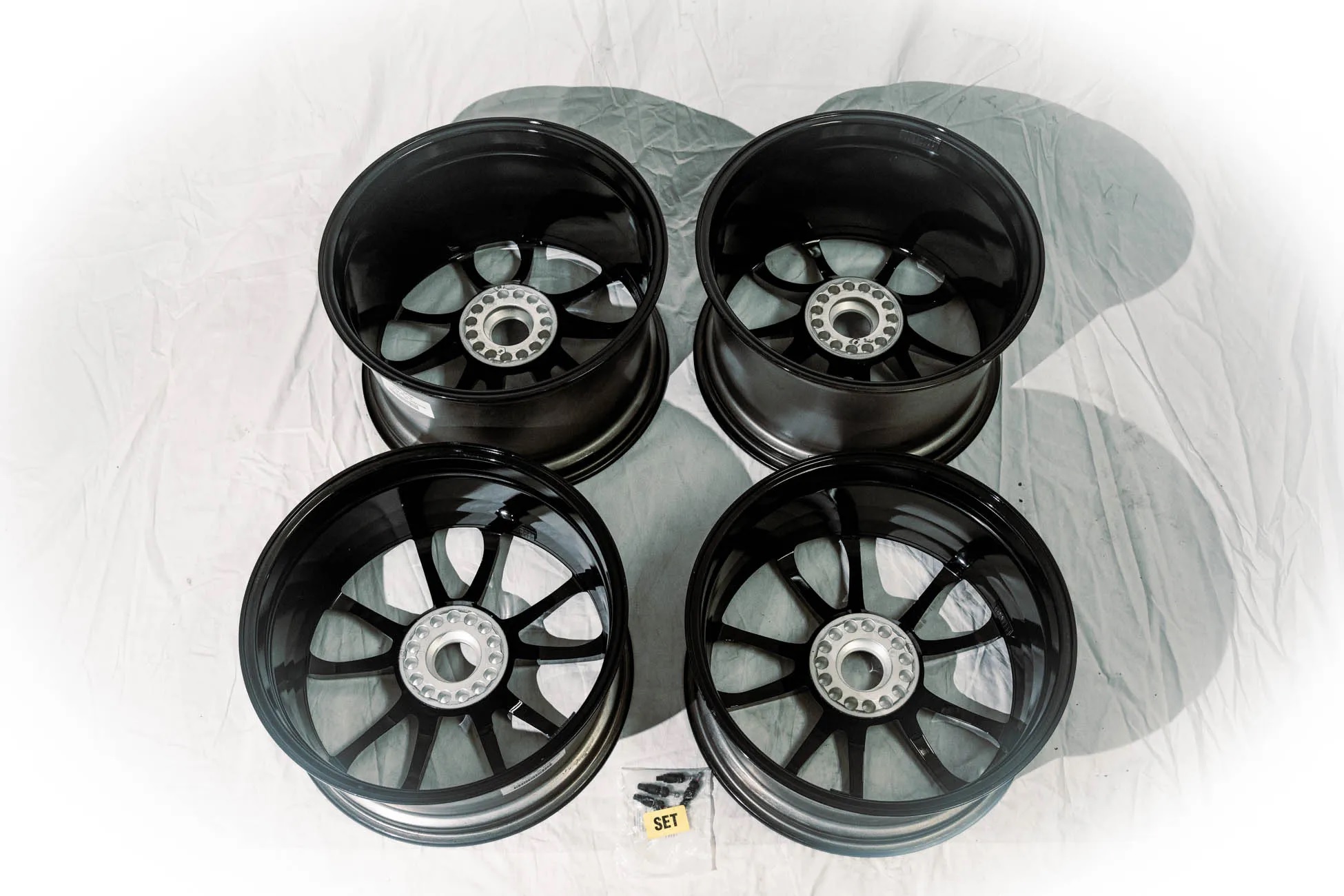 These 20″ wheels measure 9″ and 12″ in width and were produced for use on 991-generation Porsche 911 GT3 sports cars. They were factory equipment on a 2016 911 R acquired brand new, and had approximately 800 miles when they were removed and stored indoors in boxes. The wheels feature a split five-spoke, center-lock design, forged alloy construction, and a black finish.