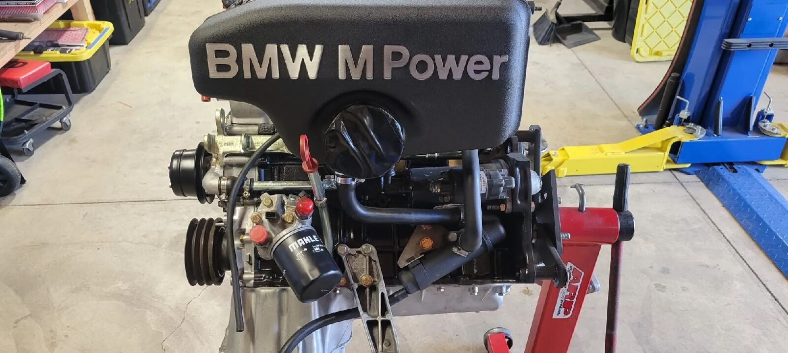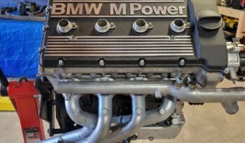 The S14B features a cast-iron block, aluminum cylinder head, dual overhead camshafts, and a black intake plenum finished with “BMW M Power” script. Included with the engine are the Getrag gearbox, differential, driveshaft, and Bosch Motronic control module, offering a complete drivetrain package.